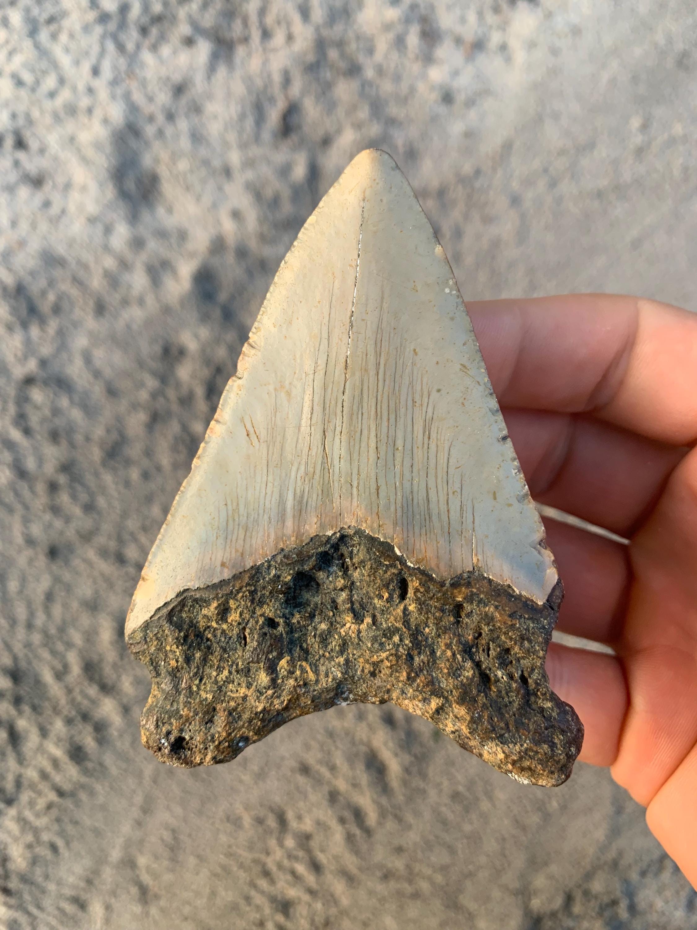 Genuine Megalodon shark teeth fossils, discovered scuba diving off the coast of North Carolina. These fossils date back to the Miocene and Pliocene epochs, approximately 3 to 20 million years old. Each tooth is naturally preserved and reflects the massive size and power of the prehistoric Otodus megalodon, one of the largest predators in Earth’s history. Our inventory is 100% authentic with no repairs.