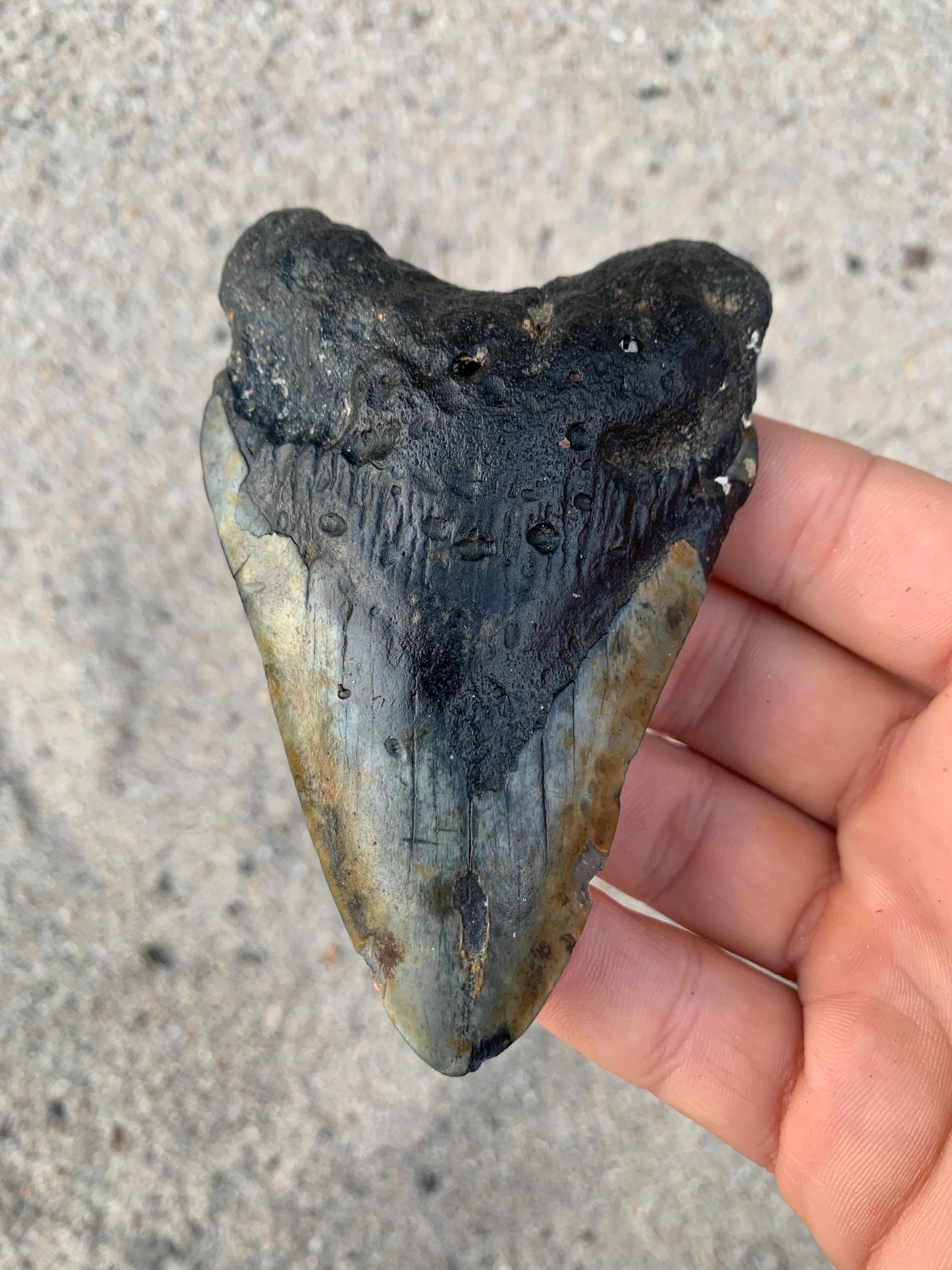 All of the shop's shark teeth are found by me diving in around 100 feet of water off of the North Carolina coast. The teeth are from the Miocene period and are between 18 - 2.5 million years old. All teeth are 100% original with no restoration or repair.