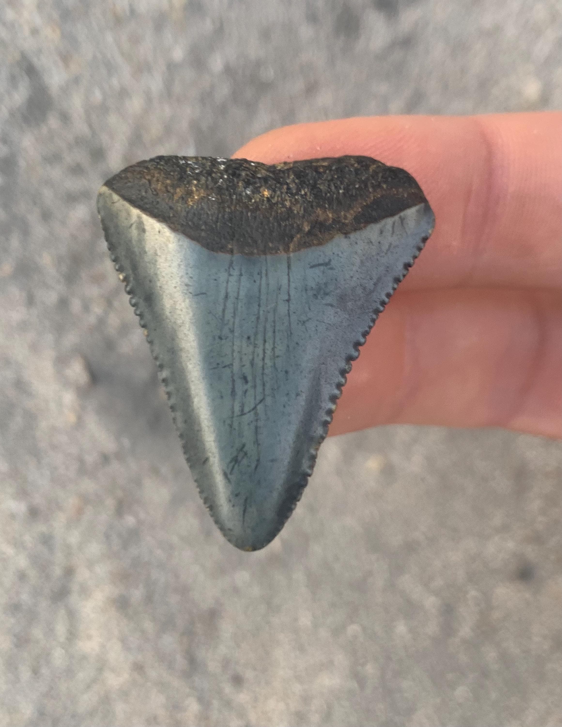 All of the shop's shark teeth are found by me diving in around 100 feet of water off of the North Carolina coast. The teeth are from the Miocene period and are between 18 - 2.5 million years old. All teeth are 100% original with no restoration or repair.